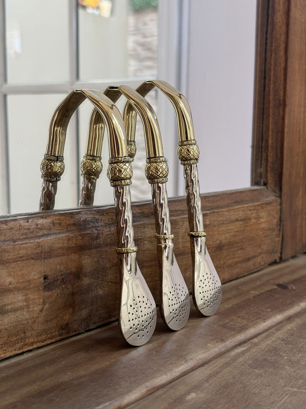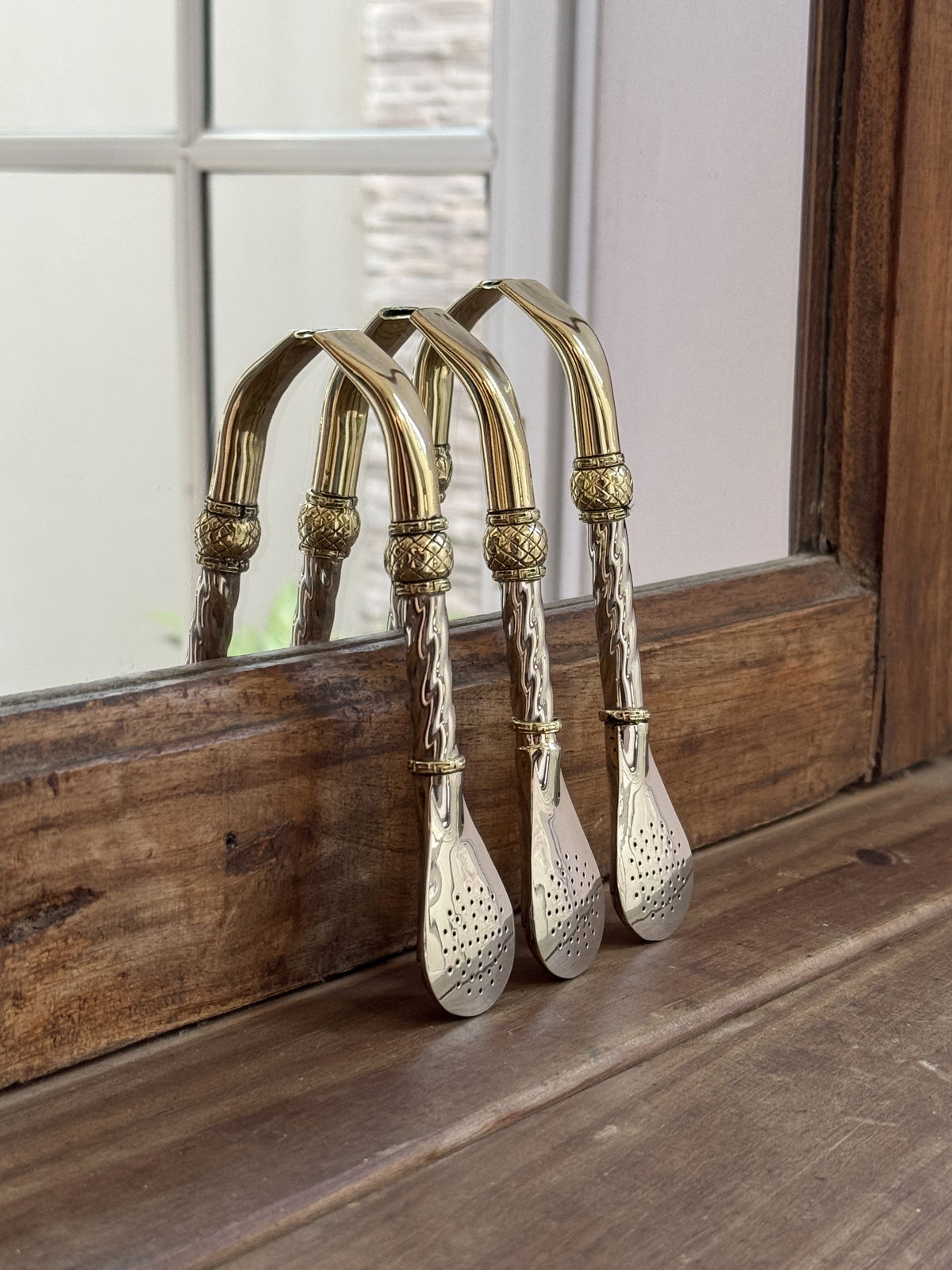 Un bombillo recto de alpaca y bronce con pico curvo cuenta con una pala grande, lo que la convierte en una pieza elegante y sofisticada que combina diseño clásico con toques modernos y de alta calidad.