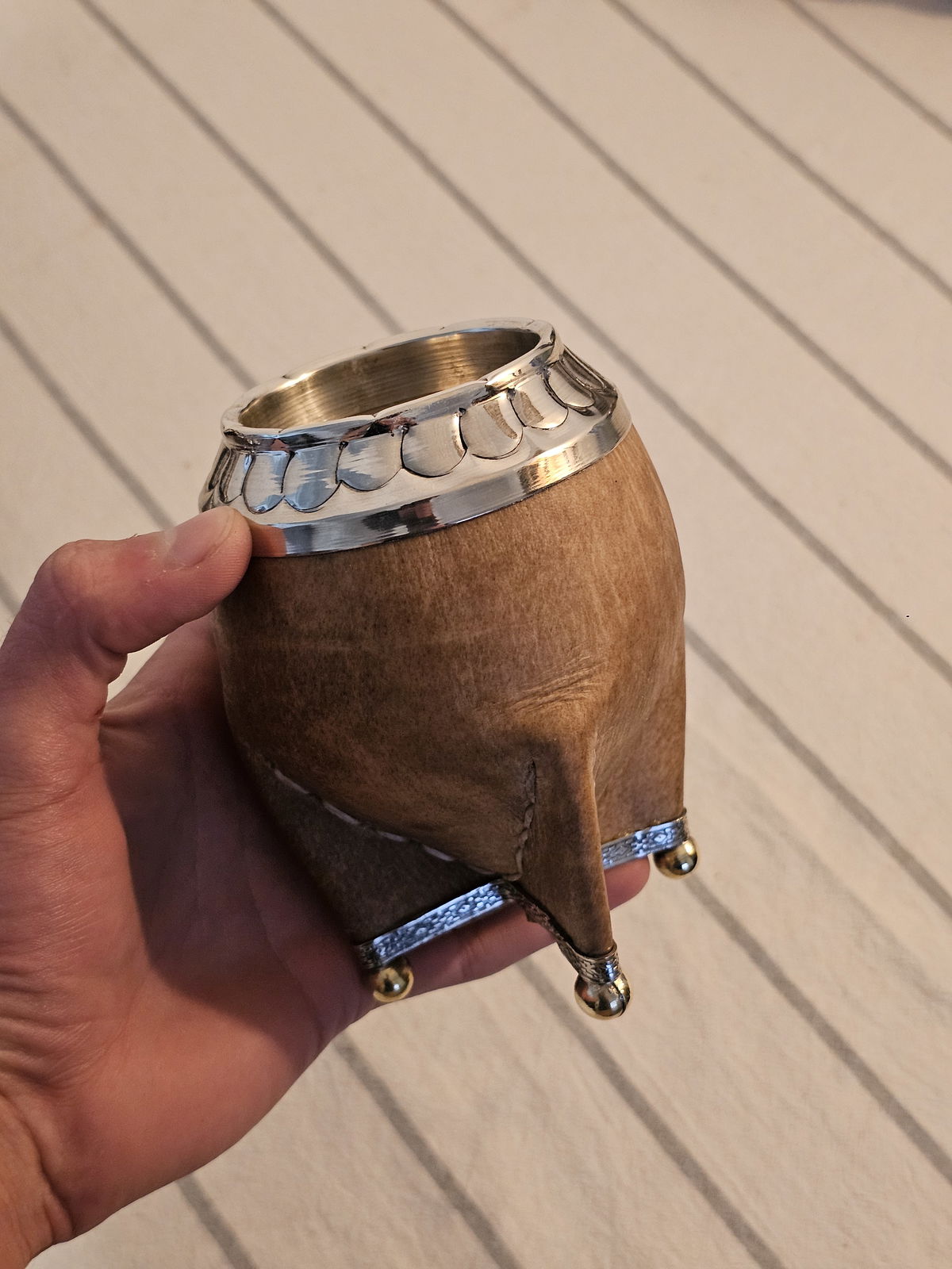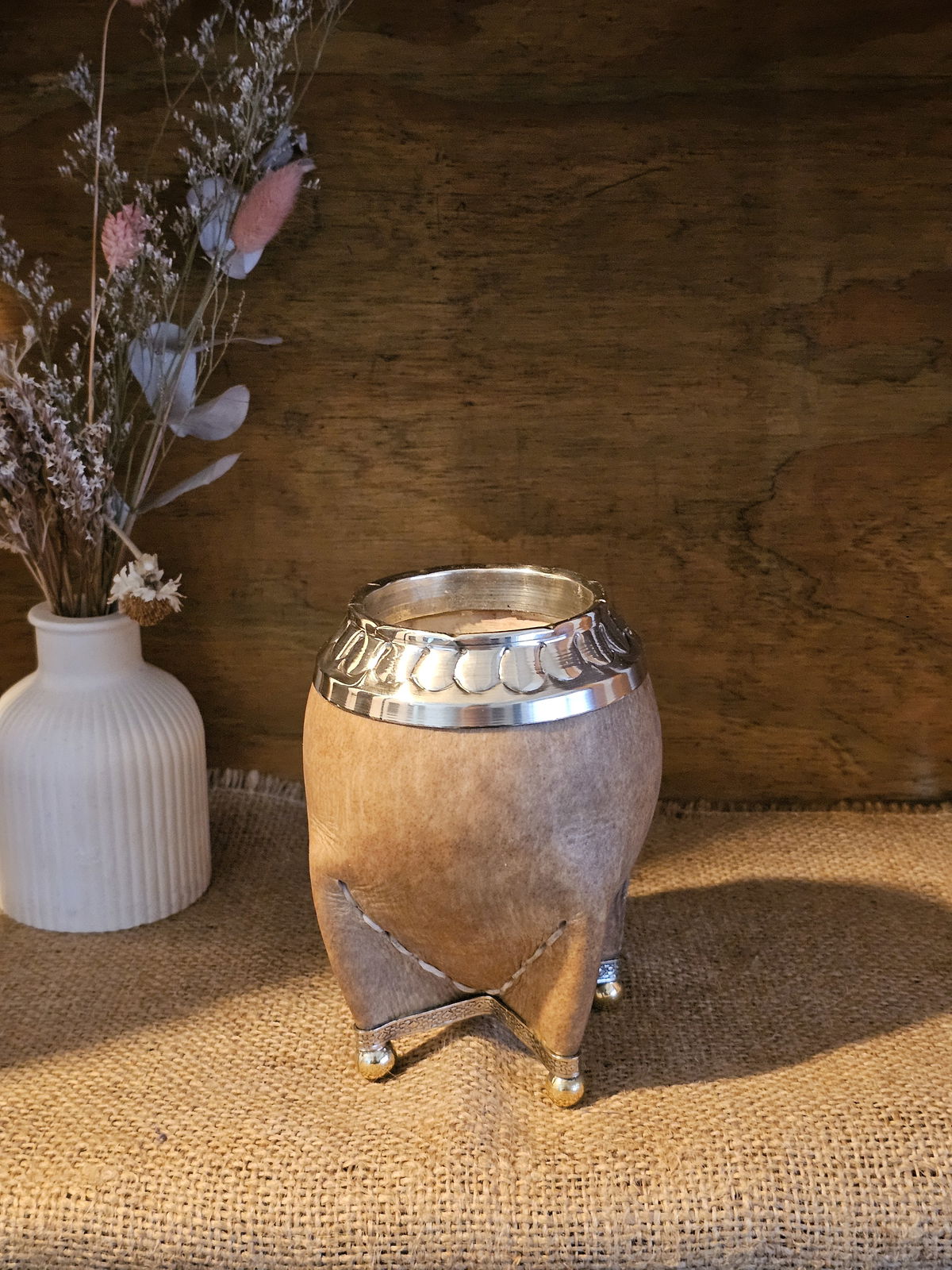 De calabaza seleccionada, forrado en cuero crudo y con detalles en alpaca: virola, guarda y base completa, más las bolitas en bronce que le dan ese toque distinguido. Es de esos mates que, con el tiempo, se curan lindo y agarran un sabor especial.