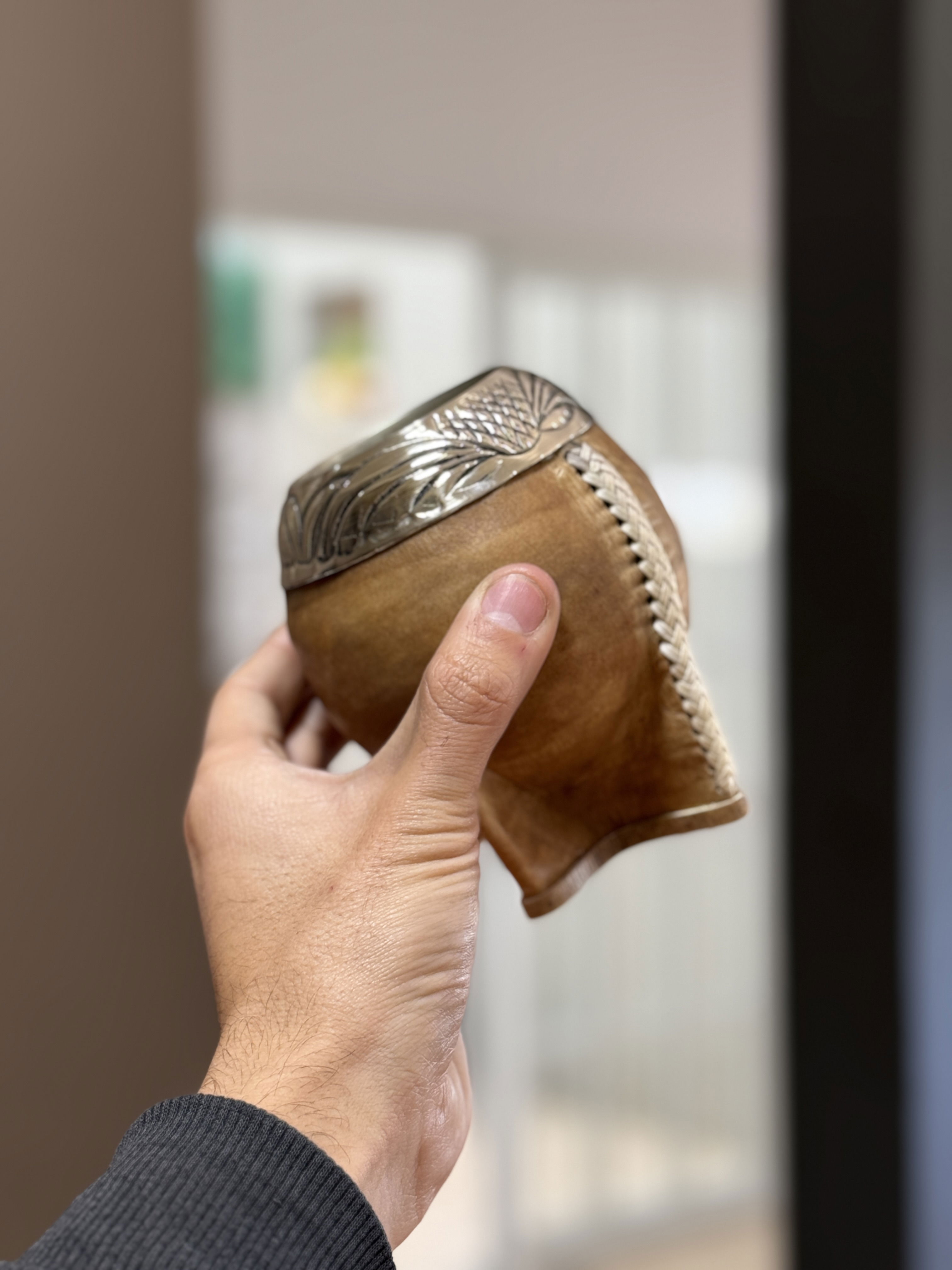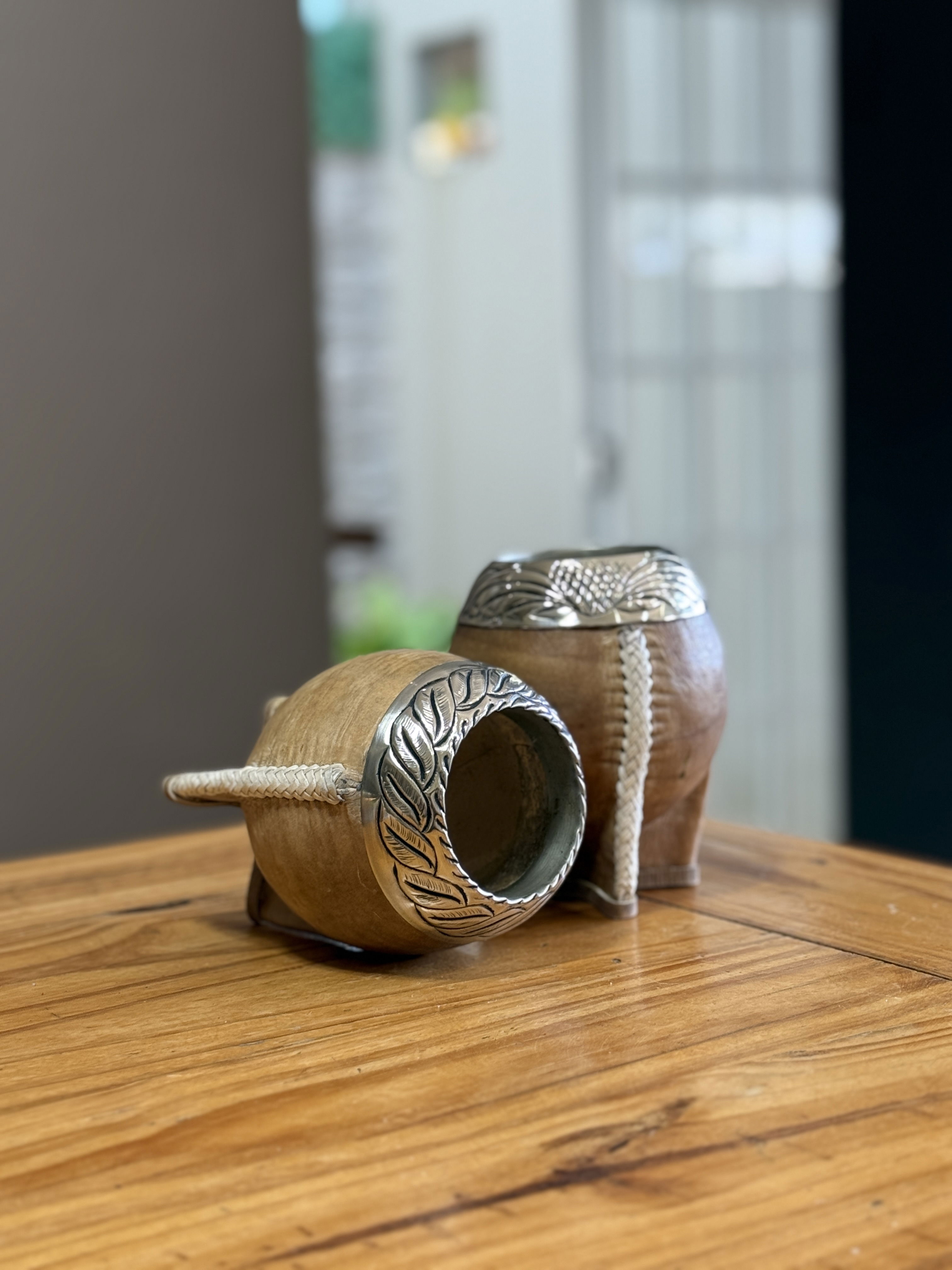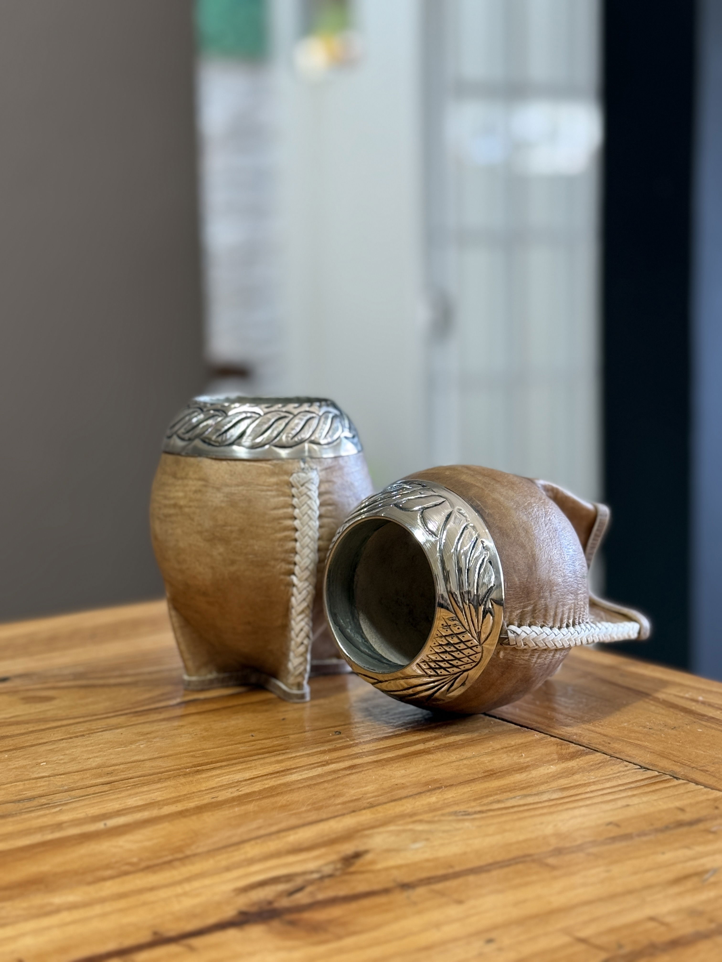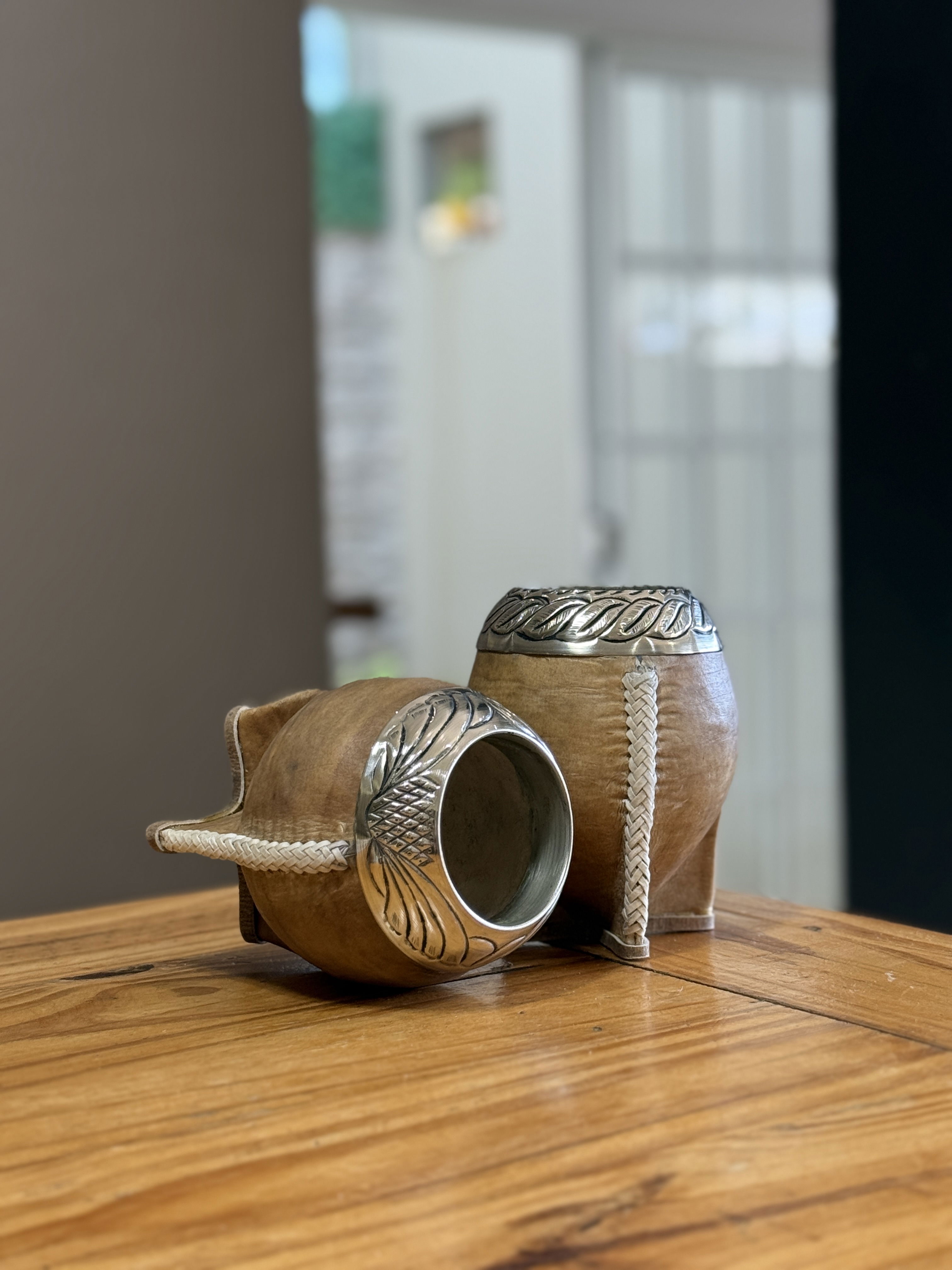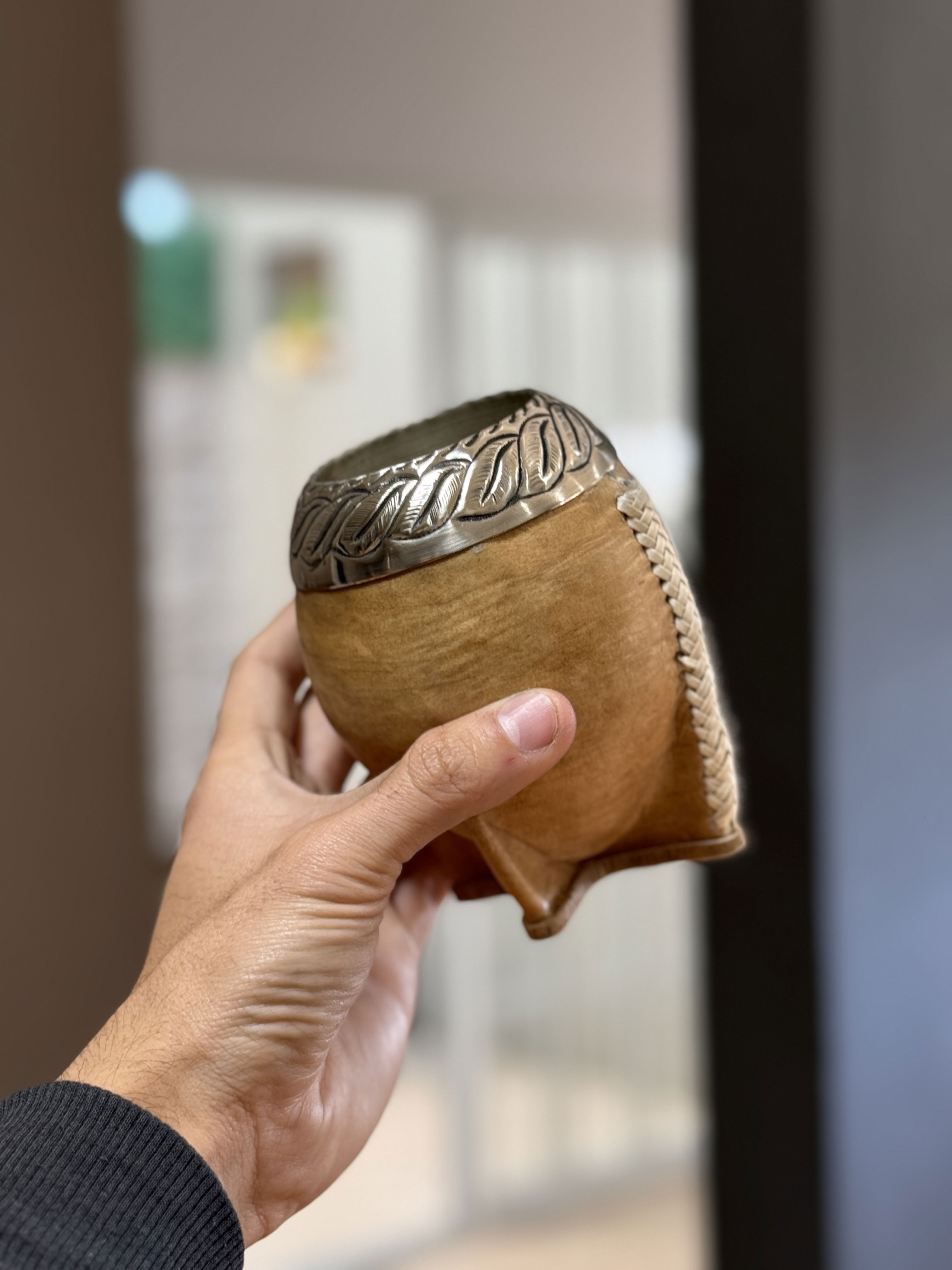 Descubrí el verdadero sabor del mate con esta pieza única . Confeccionado en cuero crudo de primera calidad, con una virola de alpaca uruguaya finamente cincelada a mano.