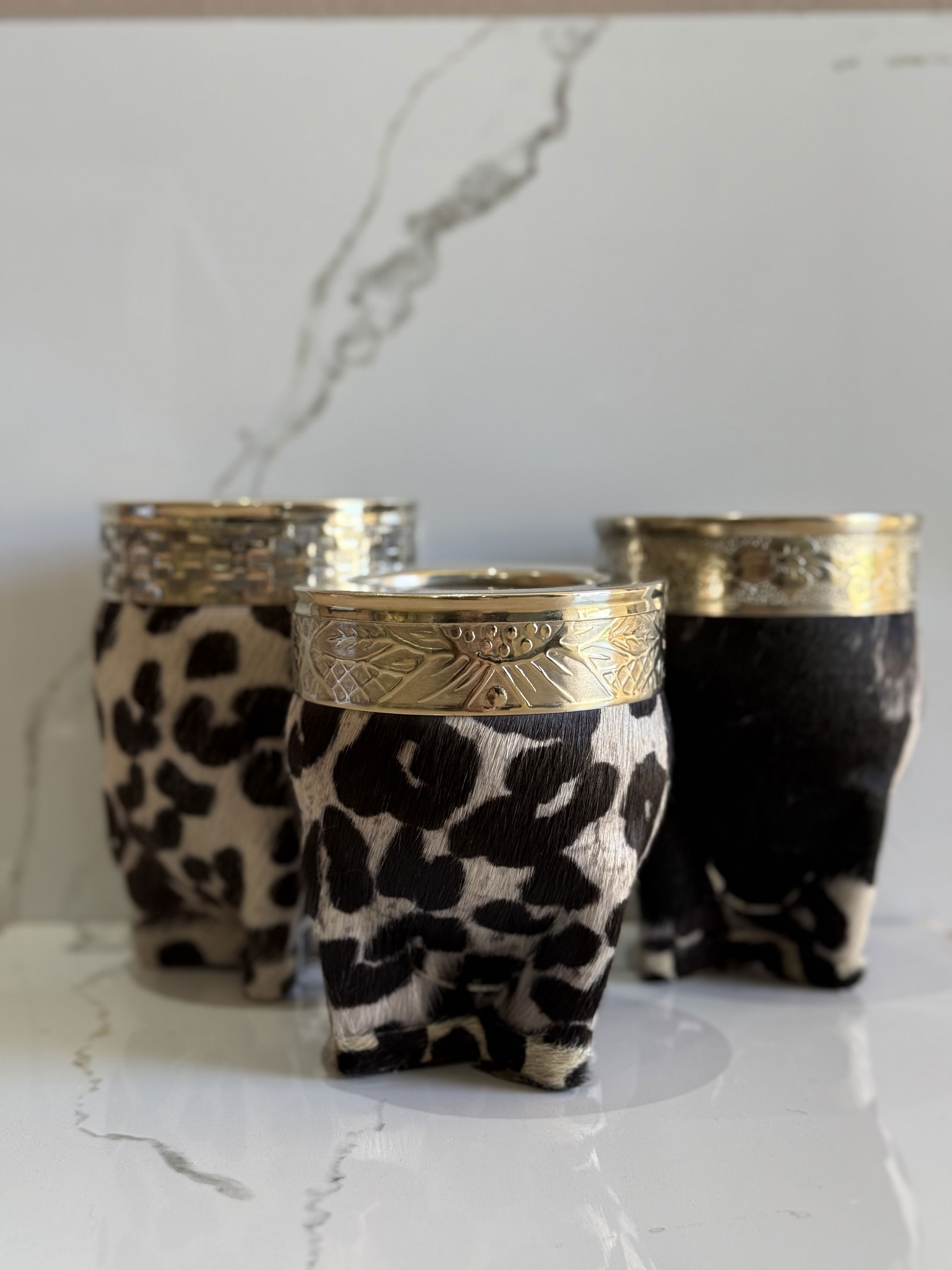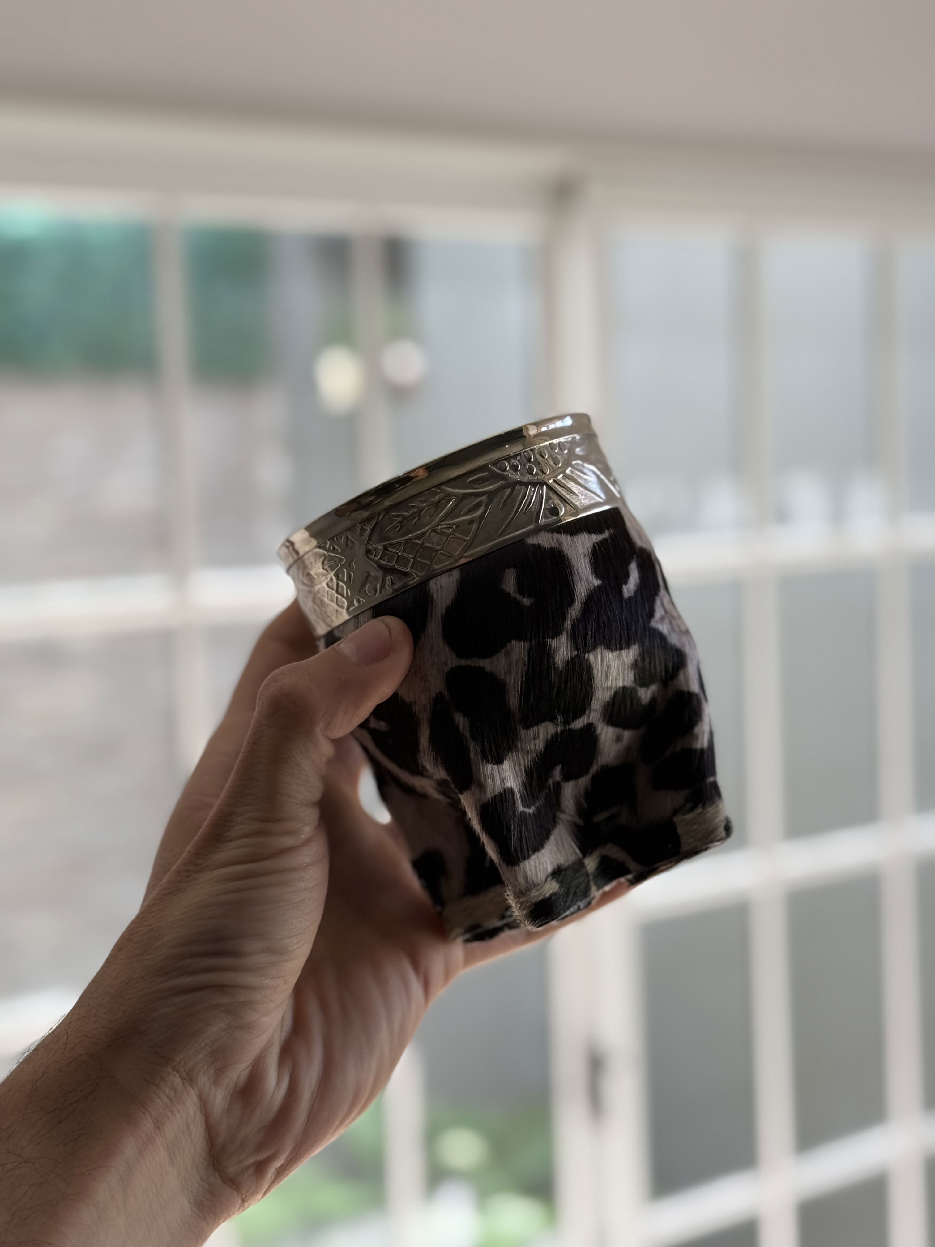 Elaborados artesanalmente, cada pieza está forrada en cuero de pelo natural con estampado de blanco y negro, lo que les otorga un carácter único e irrepetible. La parte superior está cuidadosamente rematada con virola de alpaca lisa, fusionando detalles clásicos.